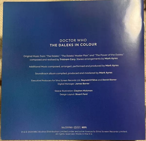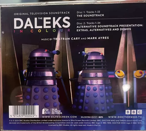 Mark Ayres: Doctor Who - The Daleks In Colour verze na 2CD v standardní edici. Toto konkrétní vydání vyšlo v Velké Británii ve vydavatelství Silva Screen dne 26. prosince 2025. Album zasahuje do žánrů Stage & Screen, Elektronická hudba a Soundtrack.