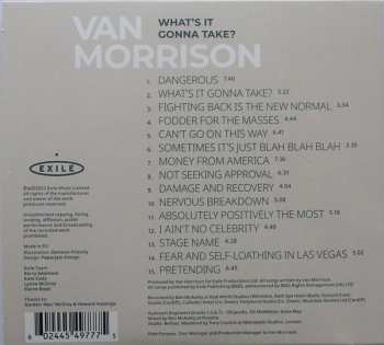 Album obsahuje patnáct nových skladeb Vana Morrisona, které odrážejí umělcovu neutuchající snahu nahrávat a vystupovat živě před publikem. Van Morrison je jedním ze skutečných hudebních originálů - naprosto jedinečný a inspirativní s odkazem, který se táhne již sedm desetiletí. Narodil se v roce 1945 v Belfastu, inspiroval se blues, country a gospelem, v roce 1964 založil mimořádně úspěšnou R&B skupinu Them a poté se jako sólový umělec vydal do jiných sfér. Van Morrison, jeden z nejplodnějších nahrávacích umělců a nejvytíženějších koncertních umělců své doby, vytvořil bezkonkurenční katalog nahrávek, který se bez námahy pohybuje mezi nesčetnými vlivy, včetně vizionářské pouliční poezie, jazzu, swingu, skifflu a keltských kořenů, stejně jako některých nejpopulárnějších písní 20. století. Na pódiu i ve studiu si také dokázal udržet pracovní morálku, za kterou by se nemuseli stydět ani mladší umělci. "What's It Gonna Take?" je 43. studiové album Vana Morrisona.