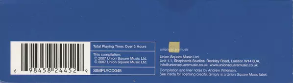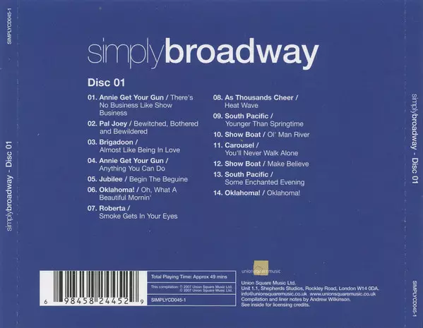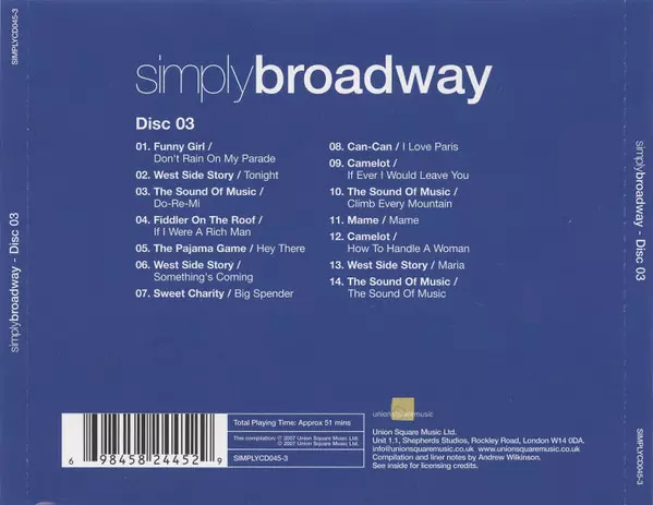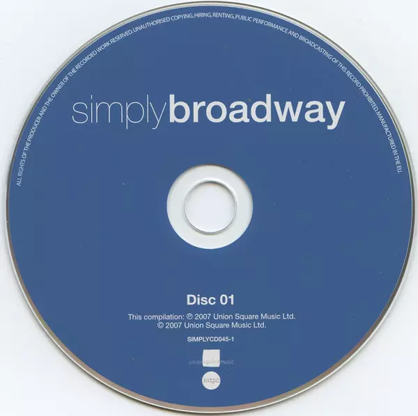 Various: Simply Broadway verze na 4CD/Box Set v standardní edici. Toto konkrétní vydání vyšlo v Velké Británii ve vydavatelství Union Square Music ve spolupráci s Simply dne 14. září 2007. Album zasahuje do žánrů Stage & Screen a Muzikál.