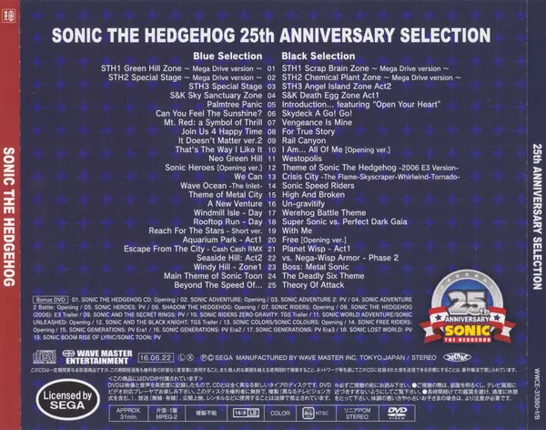 Various: Sonic The Hedgehog 25th Anniversary Selection verze na 2CD/DVD v standardní edici. Toto konkrétní vydání vyšlo v Japonsku ve vydavatelství Wave Master Entertainment dne 1. července 2016. Album zasahuje do žánrů Rock, Stage & Screen, Elektronická hudba, Pop Rock a Video Game Music.