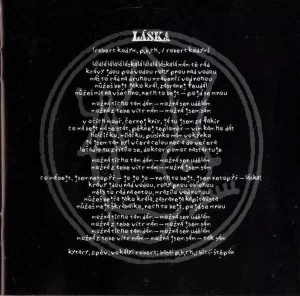 Arranged By [Vokální Aranžmá] Štěpán Smetáček | Bass Guitar P.B.Ch. | Drums, Percussion, Backing Vocals, Flute, Other [Prdelka Lenky Kelemenové] Štěpán Smetáček | Guitar, Backing Vocals, Lead Vocals Robert Kodym | Music By P.B.Ch. | Music By, Lyrics By Robert Kodym