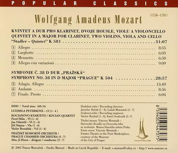 | Interpret | Wolfgang Amadeus Mozart | Prague Chamber Orchestra | Kocian Quartet | Ludmila Peterková | Ji-Hoon Ahn |