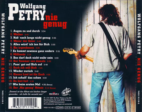 Wolfgang Petry: Nie Genug verze na CD v standardní edici. Toto konkrétní vydání vyšlo v Evropě ve vydavatelství Na Klar! dne 22. srpna 1997. Album zasahuje do žánrů Rock, Pop, Elektronická hudba, Šlágr, Pop Rock, AOR a Europop.