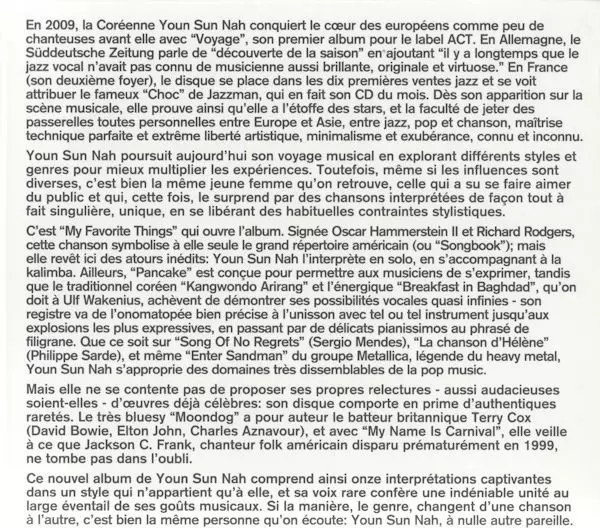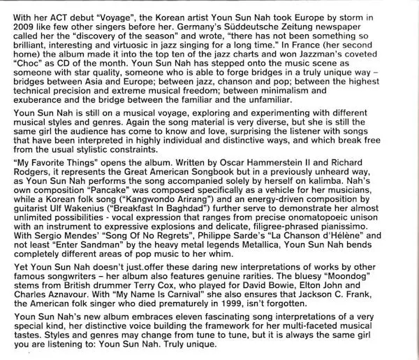 Youn Sun Nah je jihokorejská jazzová zpěvačka a hudebnice známá svým výrazným hlasem a emotivním vystupováním. Narodila se 28. srpna 1969 v jihokorejském Soulu a předtím, než se začala věnovat hudbě, vystudovala francouzskou literaturu. Její jazzová kariéra začala naplno po přestě...