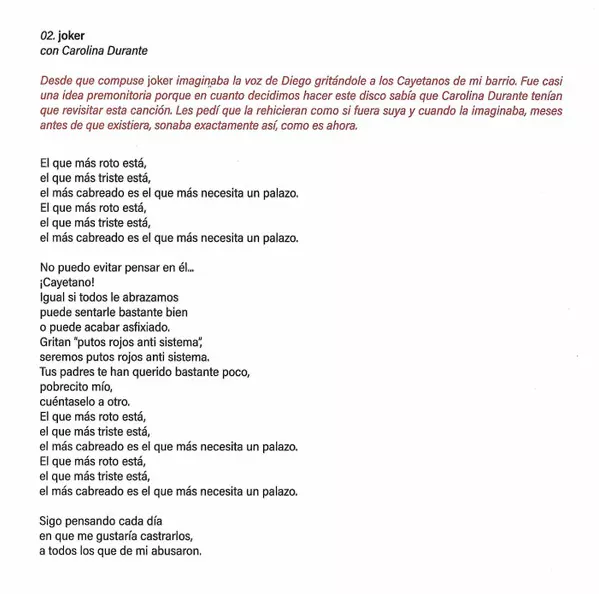| Bass Martín Vallhonrat | Drums Juan Pedrayes | Engineer [Asistente De Grabación] Daniel Delso | Engineer [Ingeniero De Grabación] José Maria Rosillo | Guitar Mario del Valle | Lyrics By Carolina Durante, Zahara | Mastered By Ángel Medina | Mixed By José Maria Rosillo | Music By Carolina Durante, Martí Perarnau, Zahara | Producer Carolina Durante, Zahara | Synthesizer, Keyboards [Casiotone] Zahara | Vocals Diego Ibáñez (2), Zahara | |||