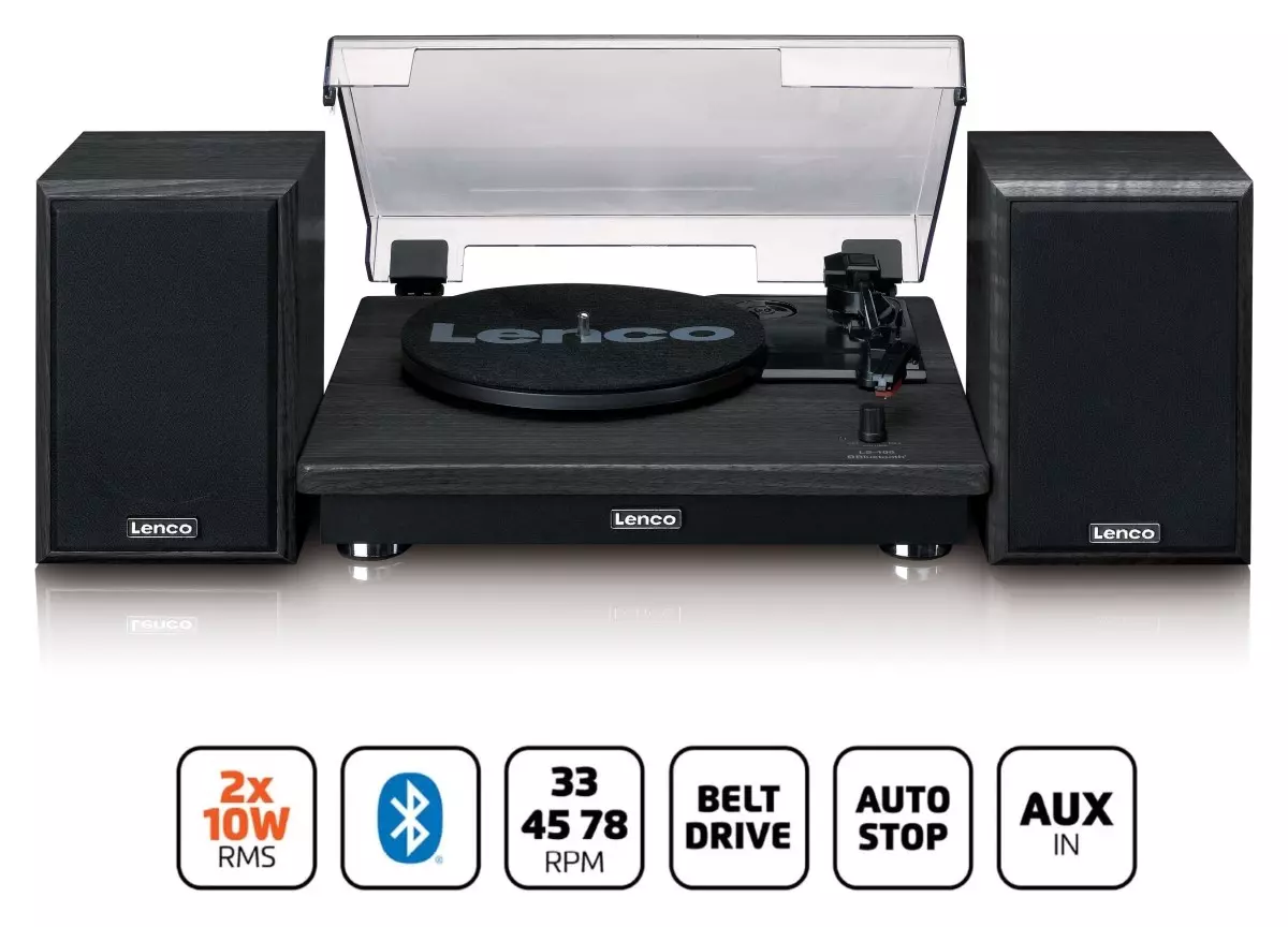 Gramofon s dřevěnými reproduktory a přijímačem Bluetooth Užijte si svou sbírku desek s gramofonem LS-100 od Lenco. Díky jeho dvěma externím reproduktorům si můžete vychutnat poslech hudby v nejvyšší možné kvalitě. Reproduktory je možné umístit odděleně od gramofonu...
